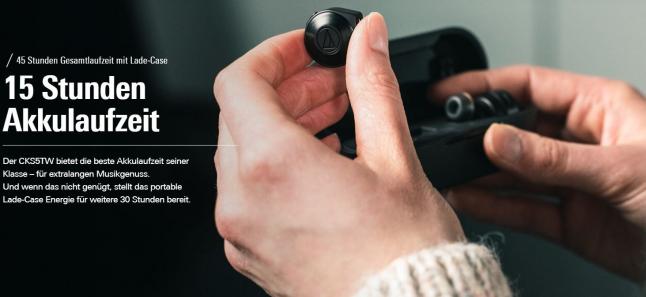 Das echt drahtlose Design der ATH-CKS5TW erlaubt ein Hörerlebnis mit ultimativem Komfort und Bewegungsfreiheit. Genießen Sie leistungsstarken High-Fidelity-Ton unterwegs - ohne Kabel, die Sie zurückhalten.